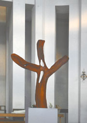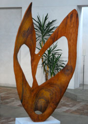 Unten zwei Holzplastiken von Wolfgang Fritz, die in der
