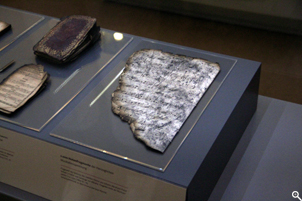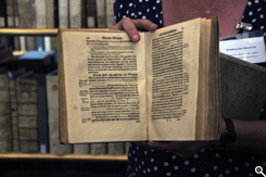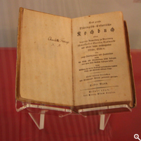 Ein altes Kochbuch und das Blatt eines beim Brand 2004 stark beschädigten Buchs.